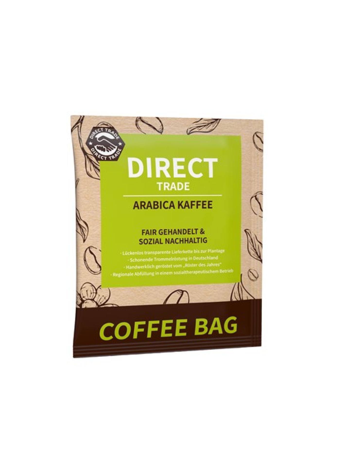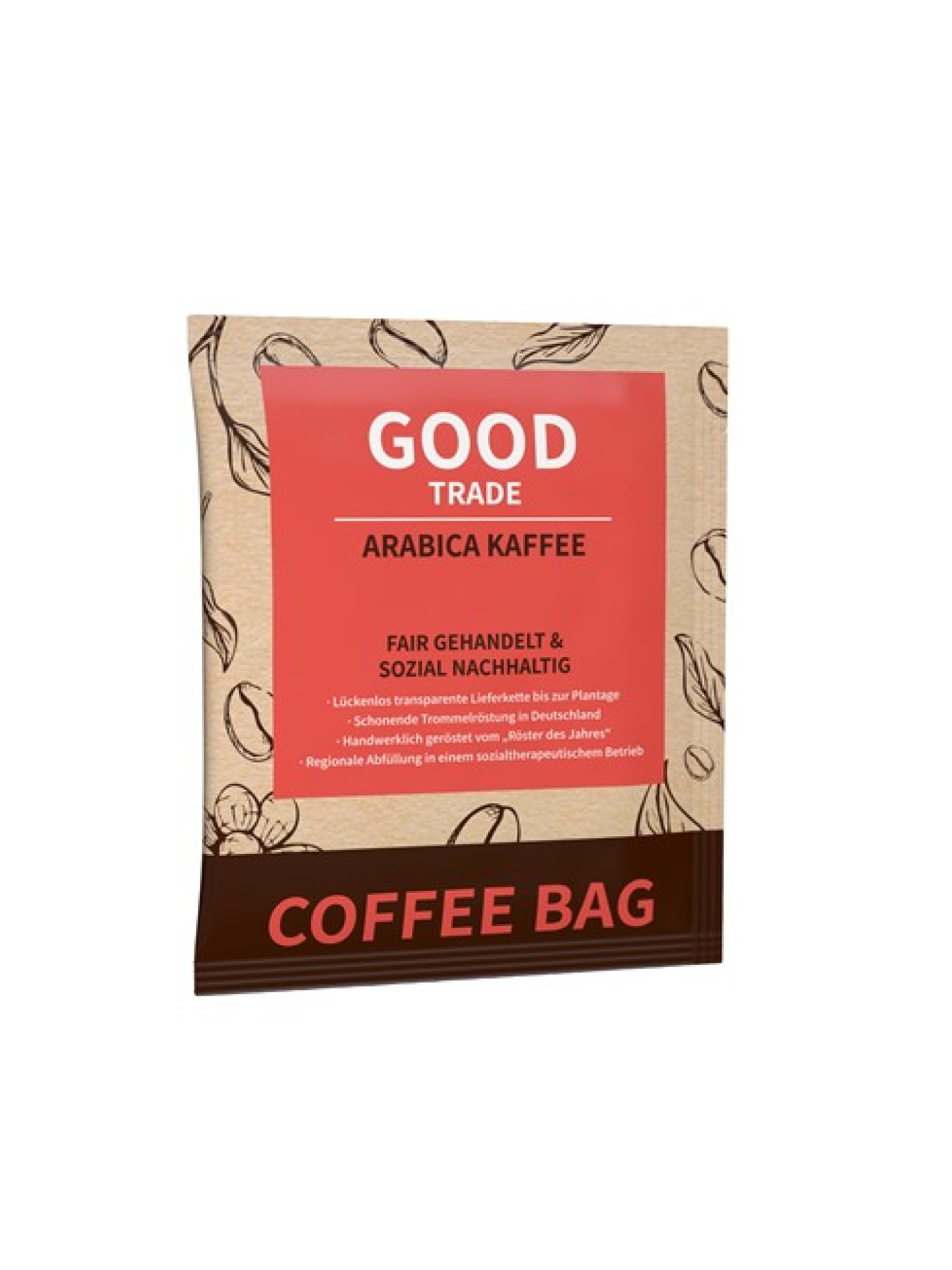 Prémiový kávový sáček s filtrem a mletou kávou Arabica přímo od pěstitelů z Peru – ekologická alternativa kapslí, s plnobarevným potiskem.